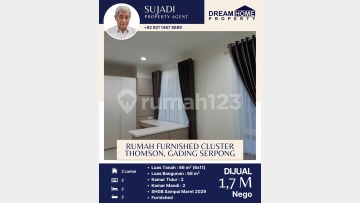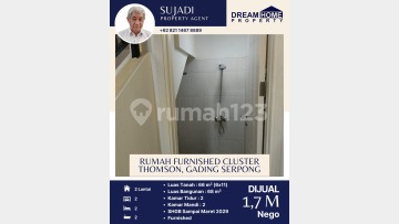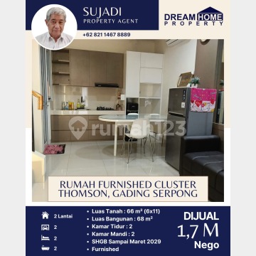 Dijual Murah Rumah Furnished di Cluster Thomson, Gading Serpong.* Luas Tanah : 66 m² (6x11) Luas Bangunan : 68 m² Kamar Tidur : 2 Kamar Mandi : 2 SHGB Sampai Maret 2029 Furnish AC 3 Unit Harga Jual : 1,7 M Nego Hubungi : Sujadi 0821xxxxxxxx Dream Home Property