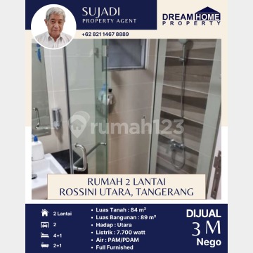 DIJUAL Rumah 2 Lantai di Rossini Utara, Tangerang Luas Tanah : 84 m² Luas Bangunan : 89 m² Kamar Tidur : 4+1 Kamar Mandi : 2+1 Hadap : Utara Listrik : 7.700 watt Air : PAM/PDAM Ada Canopy Carport 2 mobil Full Furnished : - 2 TV - 6 AC - Kitchen set - Sofa - Tempat tidur, dan lain-lain Harga Rp 3M (Nego) Hubungi : Sujadi 0821xxxxxxxx Dream Home Property