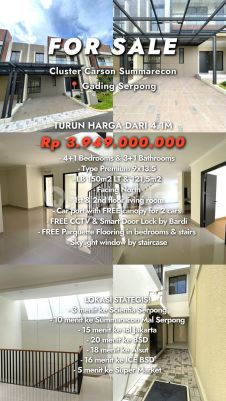 "F O R S A L E Cluster Carson Summarecon, Gading Serpong Specifications : - 4+1 Bedrooms - 3+1 Bathrooms - 9x13.5 (LB 150m2 LT 121,5m2) 3.5M Untuk Informasi Lengkap, Hubungi: Owen Era Fiesta 0811887xxxx *aby