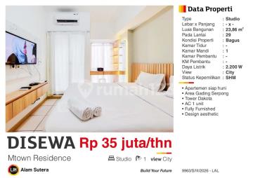 Apartemen 29 lantai di Gading Serpong, Tangerang. For rent di wilayah yang nyaman. Dengan spesifikasinya adalah sebagai berikut: - Kamar Tidur: 1 - Kamar Mandi: 1 - Sertifikat: Strata - Daya Listrik: 2200 W - Kondisi Perabotan: Furnished Telah lengkap dengan fasilitas: - Wastafel. - Kitchen Set. - Pemanas Air. - AC. - Kompor. - Kolam Renang. - Taman. - Kolam Renang. Dan properti ini juga pilihan tepat karena: - Full Furnished. - Siap Huni. - Bebas Banjir. - Dekat Fasilitas Kesehatan. - Dekat Universitas. - Dekat Akses Tol. - Dekat Pusat Perbelanjaan. - Lokasi dipusat kota. - City View. - Properti Bisa Nego. - Lokasi Strategis. Lokasi apartemen ini strategis, hanya selangkah menuju berbagai fasilitas utama dan menarik. Dengan Rp. 2.916.667, anda bisa langsung dapatkan apartemen premium di daerah Gading Serpong ini. Tersedia juga untuk rental period .