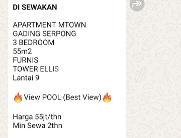 Disewakan Apartemen M.Town Tower Ellis, type 3 bedroom Luas Bangunan 55 m2 Unit terletak di lantai 9 View hadap Kolam Renang Kondisi Furnish Lokasi sangat strategis Dekat area kuliner Harga sewa seb 55 juta/ tahun Minimal sewa 2 tahun atau lebih Untuk info lebih lanjut,bpk/ibu harap menghubungi Sandy hp no.0816169xxxx Kode listing Sandy-Edhy