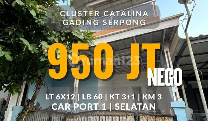 Jual Cepat CLUSTER CATALINA - GADING SERPONG spek : Luas Tanah : 72m2 ( 6x12 ) Luas Bangunan : 60m2 Kt : 3+1 (sudah direnovasi) ada kamar luas utama di atas / lantai 2 Km : 3 -tersedia tempat untuk mencuci pakaian,jemur -ada balkon sertifikat : SHM Hadap Selatan listrik : 2200 watt 950 JUTA NEGO Dijual kosongan Dekat dengan pos Rata2 semua row jaln 1 mobil Bisa nego sampai deal Sudah baja ringan Sudah gas alam