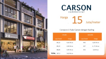 Limited Unit Kavling Komersial Gading Serpong di Boulevard Summarecon Harga 6 M Ukuran Kavling Start 250 m² Harga Start 6 M-an Lokasi sudah RAMAI Terbuka untuk INVESTOR TINGGI Bangunan minimal 7 meter CITY HUB COMMERCIAL Rp 27.5 Juta per m² LT 231 m² Rp 6.35 M LT 300 m² Rp 8.26 M LT 298 m² Rp 8.95 M Insentif Bangun Cashback Rp 2.5 juta per m² CARSON COMMERCIAL Rp 15 juta per m² LT 443 m² Rp 6.65 M LT 447 m² Rp 6.71 M LT 453 m² Rp 6.8 M Insentif Bangun Cashback Rp 2 juta per m² SOUTH GOLDFINCH Rp 35 juta per m² LT 272 m² Rp 10.4 M LT 276 m² Rp 9.67 M LT 282 m² Rp 9.89 M LT 342 m² Rp 11.95 M Insentif Bangun Cashback Rp 2.5 juta per m² Jenis Usaha: Restaurant, Cafe, Coffee Shop, Bar, Pre-School, Fitness Cara Bayar Cash Keras dan Cicil 15x