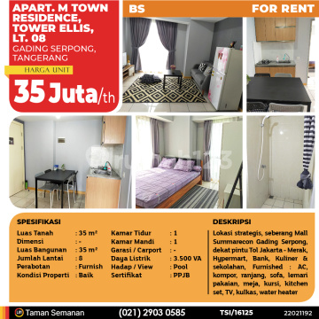 TSI/16125 For Rent Apartemen M Town Residence, Tower Ellis, Gading Serpong, 35 m², Lt. 08, PPJB Harga Rp 35 Juta /th Alamat Gading Serpong, Tangerang Deskripsi Properti Lokasi strategis, seberang Mall Summarecon Gading Serpong, dekat pintu Tol Jakarta - Merak, Hypermart, Bank, Kuliner & sekolahan, Furnished : AC, kompor, ranjang, sofa, lemari pakaian, meja, kursi, kitchen set, TV, kulkas, water heater Luas Tanah 35 m² Dimensi - Luas Bangunan 35 m² Jumlah Lantai 8 Perabotan Furnish Kondisi Baik Kamar Tidur 1 Kamar Mandi 1 Garasi mobil - Jalur Telepon - Daya Listrik 3.500 VA Hadap / View Pool Sertifikat PPJB LJH Realty Taman Semanan Property Help ✆ 0212903xxxx