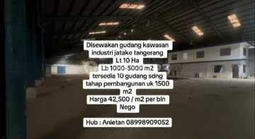 Disewakan Gudang Kawasan Industri Jatake Tangerang Lt 10 ha Lb 1000xxxx m2 Tersedia 10 gudang sedang tahap pembangunan uk 1500 m2 harga 42.500 /m2 perbulan nego