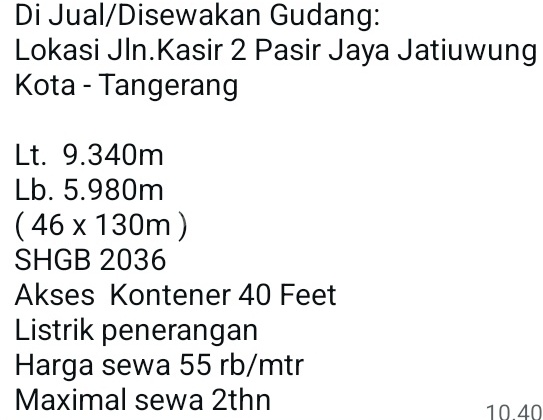 Jual dan Disewakan Gudang!!! Lokasi: Jln.Kasir 2 Pasir Jaya Jatiuwung Kota - Tangerang Luas tanah: 9.340m Luas bangunan: 5.980m (46 x 130m) SHGB 2036 Akses Kontener 40 Feet Listrik penerangan Harga sewa 55.000/m= (55.000 x 5.980 x 12 bulan= 394680xxxx Maximal sewa 2thn unit ready dan bisa disurvei Mitoy