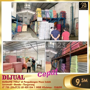 DIJUAL CEPAT Siap Pakai GUDANG 750m² di Pergudangan Nusa Indah Jurumudi - Benda - Tangerang 10 menit Bandara Soetta 5 menit Tol Benda Kontainer 40 feet Jalan komplek lebar, cor beton Keamanan 24 jam Luas Tanah 750 m² Dimensi 20x37,5 m² Luas Bangunan 420 m² Kamar Mandi 1 Listrik 3.500 Watt Air Tanah Sertifikat SHGB (berlaku sampai Sept 2045) Hadap Selatan Harga 9,5 M Nego Hub : Fenny 0821xxxxxxxx