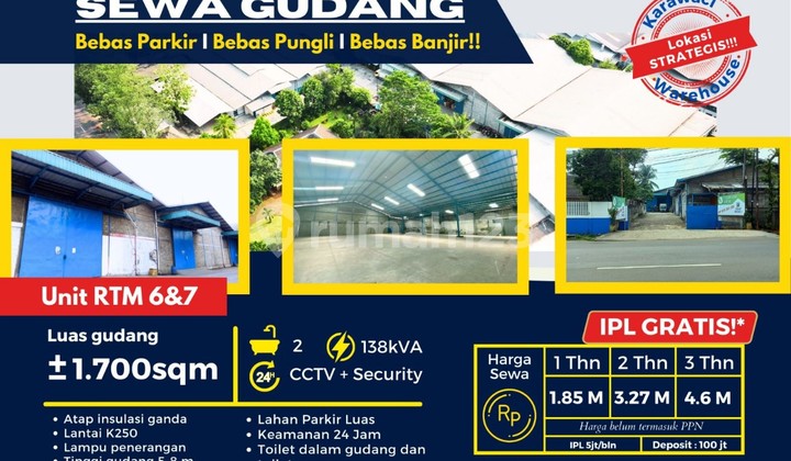IL0304 DISEWA GUDANG KARAWACI UK 1700 sqm lahan parkir luas ADA KANTOR AT Tanggerang Banten DISEWA GUDANG KARAWACI Luas ±1700 sqm 2 KM FREE IPL MIN SEWA 2 TAHUN INCLUDE KANTOR, ADA CCTV + SECURITY, LISTRIK 138KVA, TINGGI GUDANG 5-8 METER HARGA SEWA: 1,85M/TAHUN