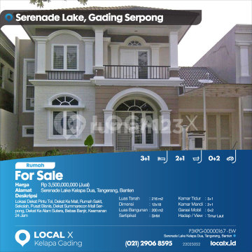 Lokasi Dekat Pintu Tol, Dekat Ke Mall, Rumah Sakit, Sekolah, Pusat Bisnis, Dekat Summarecon Mall Serpong, Dekat Ke Alam Sutera, Bebas Banjir, Keamanan 24 Jam For Sale - Jual Rumah Serenade Lake Kelapa Dua, Tangerang, Banten Harga. Rp 350000xxxxJual) Deskripsi Properti. Lokasi Dekat Pintu Tol, Dekat Ke Mall, Rumah Sakit, Sekolah, Pusat Bisnis, Dekat Summarecon Mall Serpong, Dekat Ke Alam Sutera, Bebas Banjir, Keamanan 24 Jam Luas Tanah. 216 m2 Dimensi. 12x18 Luas Bangunan. 200 m2 Sertipikat. SHM Kamar Tidur. 3+1 Kamar Mandi. 2+1 Garasi Mobil. 0+2 Hadap / View. Timur Laut LOCAL X Kelapa Gading ******** ⓪②① ②⑨⓪⑥ ⑧⑤⑨⑤ P3KPG-0000xxxx-EW-J