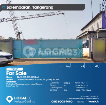 (Rp6.5jt/m2) Peruntukan Industri, Lokasi Strategis, Dekat Akses Tol For Sale - Jual Tanah Jl. Raya Salembaran Kosambi, Tangerang, Banten Harga. Rp 7800000xxxxJual) Deskripsi Properti. (Rp6.5jt/m2) Peruntukan Industri, Lokasi Strategis, Dekat Akses Tol Luas Tanah. 12000 m2 Dimensi. 41x Luas Bangunan. 12000 m2 Sertipikat. SHM Kamar Tidur. - Kamar Mandi. - Garasi Mobil. - Hadap / View. Barat LOCAL X Kelapa Gading ******** ⓪⑧①③⑧⓪⓪⑧⑨⓪⑨⓪ P3PIK-0000xxxx-CI-J