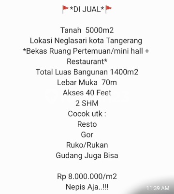 Dijual 1 ha Tanah di depan Telaga Cluster, dekat Kana Park, Legok,Tangerang Terletak di depan Jalan Raya Surat2 AJB, pembeli siap terima SHM Cocok untuk Rumah Duka. Harga jual seb 2 juta/m2 nego Utk info lebih lanjut,bpk/ibu harap menghubungi Sandy hp no.0816169xxxx kode listing sandy-edhy2