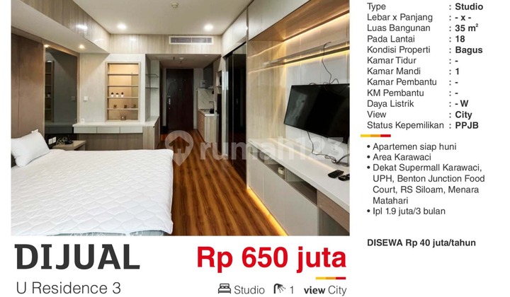 APARTMENT U RESIDENCE 3 LIPPO KARAWACI ▪️tipe : studio ▪️luas : 35 m² ▪️km : 1 ▪️listrik : 2200 Watt ▪️sertifikat : PPJB siap AJB ▪️full furnished ▪️view SuperMall dan U-residence 2. ▪️lokasi trategis tinggal jalan kaki ke uph. *IPL 1,9 juta per 3 bulan(diluar sinking fund) ~Harga 650 juta nego