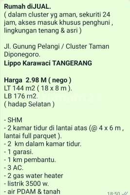 TURUN HARGA‼ Rumah Cluster Taman Di Ponegoro, Lippo Karawaci LT 144 (8x18) LB 176 KT 2+1 KM 2+1 Semifurnish - AC 3, - water heater 2 - Garasi 1, - Carport 1 - Kamar tidur full parquet - semua kamar tidur ada kamar mandi dalam - Listrik 3500W Surat SHM Hadap Selatan Jadi Rp. 2.500.000.xxx nego EDDY LIM 08219900xxxx [Yunita]