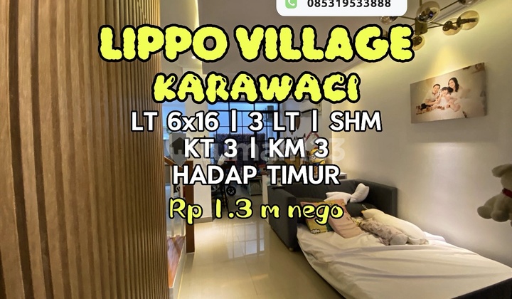 Harga 1,3m nego sampai jadi Dijual Rumah Hadap Timur Lokasi di Lippo Village Spesifikasi Unit : 1. LT 96m2 (6x16), LB 180m2 I 3 Lantai 2. 3 Kamar Tidur, 3 Kamar Mandi 3. Listrik 5500 Watt, Air PAM 4. Hadap Timur, Sertifikat SHM 5. terdapat ruang kerja, Mudroom, Pantry Room, Service Area, Gudang, Balkon, Rooftop, Ruang bermain anak 6. Harga Pasar Penilaian jaminan 1.9 M *(Note : Harga KJPP penilaian jaminan 1.9 M)*