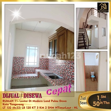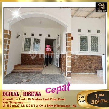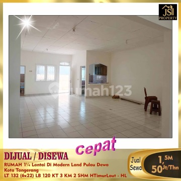 DIJUAL/DISEWA CEPAT RUMAH 1¼ Lantai Di Modern Land Pulau Dewa Kota Tangerang Dekat Rs Maya pada,Sekolah Bpk Penabur,Mall Tangerang City Luas Tanah 132 M² Luas Bangunan 120 M² Ukuran 6 x 22 M² 1¼ lantai Kamar Tidur 3 Kamar Mandi 2 Listrik 22000 Kwh Air PAM Hadap Timur Laut ke utara Sertifikat SHM Jalan 2 mobil Harga Jual 1.5M Nego - HL Harga Sewa 50Jt/Thn