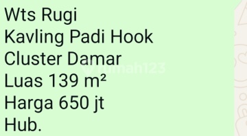Wts Rugi Kavling Padi Hook Cluster Damar Luas 139 m² Harga 650 jt Hub. sarisas vianwa lebih fast respon frki