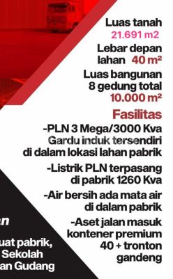 Disewakan Gudang ijin industri Di kawasan Harvest Pasar Kemis tangerang LT 21,691m LB 2226m celling 7m LB 650m celling 7m LB 2150m celling 9m LB 1516m celling 9m LB 1587m celling 9m LB 2130m celling 9m Listrik 3000 KVA Akses kontener 40 feet Harga sewa 40rb/m/bln exc ppn (A11)