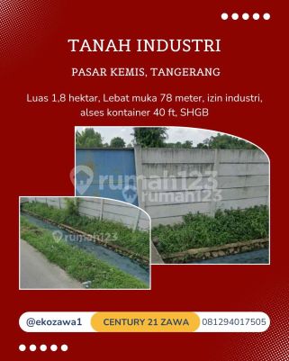 DIJUAL TANAH INDUSTRI PASAR KEMIS Lokasi : Pasar Kemis - Tangerang Spec : * Luas Tanah 18.000 m² || 1,8 Ha * Lebar Muka 78 meter * Sertipikat SHGB * Ijin Industri * Akses Container 40 Feet HARGA JUAL 3,5 Juta / m² - EXC PPN - NEGOTIABLE Terima Titip dan Jual Beli Property Seluruh Indonesia KHUSUS PEMBELI SERIUS silakan hubungi: Eko Pakpahan 0812xxxxxxxx Century21 Zawa PIK ********