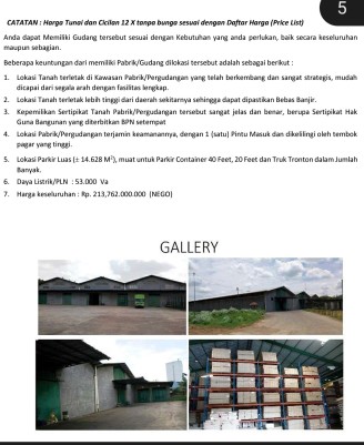 Dijual Gudang/Pabrik Ready Stock di KAWASAN INDUSTRI PERGUDANGAN 28 @PASIRJAYA TANGERANG INDUSTRIAL / WAREHOUSE yang terdiri dari 10 (sepuluh) unit bangunan Pabrik / Gudang dengan luas keseluruhan Tanah ± 39.330m² dengan ukuran dan harga sbb: LT/LB HARGA; GUDANG 1: 23 x 120 = 2.760 Lt.1 = 23 x 120 Lt.2 = 23 x 120 Rp. 25.171.200.xxx,- GUDANG 2: 23 x 120 = 2.760 Lt.1 = 23 x 120 Lt.2 = 23 x 84 Rp. 23.929.200.xxx,- GUDANG 3: 23 x 120 = 2.760 Lt.1 = 23 x 120 Lt.2 = 23 x 120 Rp. 25.171.200.xxx,- GUDANG 4: 23 x 102 = 2.346 1 Lt = 23 x 102 Rp. 19.927.200.xxx,- GUDANG 5: 23 x 102 = 2.346 1 Lt = 23 x 102 Rp. 19.927.200.xxx,- GUDANG 6: 23 x 102 = 2.346 1 Lt = 23 x 102 Rp. 19.927.200.xxx,- GUDANG 7: 23 x 102 = 2.346 1 Lt = 23 x 102 Rp. 19.927.200.xxx,- GUDANG 8: 23 x 102 = 2.346 1 Lt = 23 x 102 Rp. 19.927.200.xxx,- GUDANG 9: 23 x 102 = 2.346 1 Lt = 23 x 102 Rp. 19.927.200.xxx,- GUDANG 10: 23 x 102 = 2.346 1 Lt = 23 x 102 Rp. 19.927.200.xxx,- Gudang tersebut dpt dibeli sesuai dg Kebutuhan baik secara keseluruhan maupun sebagian. Beberapa keuntungan dari memiliki Pabrik/Gudang dilokasi tersebut adalah sbb : 1. Lokasi Tanah terletak di Kawasan Pabrik/Pergudangan yang telah berkembang dan sangat strategis, mudah dicapai dari segala arah dengan fasilitas lengkap. 2. Lokasi Tanah terletak lebih tinggi dari daerah sekitarnya sehingga dapat dipastikan Bebas Banjir. 3. Kepemilikan Sertifikat Tanah Pabrik/Pergudangan tersebut sangat jelas dan benar, berupa Sertipikat Hak Guna Bangunan yang diterbitkan BPN setempat 4. Lokasi Pabrik/Pergudangan terjamin keamanannya, dengan 1 (satu) Pintu Masuk dan dikelilingi oleh tembok pagar yang tinggi. 5. Lokasi Parkir Luas (14.628 M²), muat untuk Parkir Container 40 Feet, 20 Feet dan Truk Tronton dalam Jumlah Banyak. 6. Daya Listrik/PLN : 53.000 Va 7. Harga keseluruhan : Rp. 2137xxxxxxxxNEGO) Anna Reni SolidPro