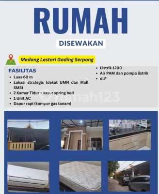 DISEWA MURAH Rumah MEDANG LESTARI Summarecon Serpong Scientia GADING SERPONG Deskripsi Luas Tanah 60 m2(6x10) LBangunan 27 m2 KTidur 2 KMandi 1 Furnished 1AC,Kulkas,TV21 inch,Rak Kitchen set+perlengkapan makan Kompor gas, sofa,2 Tempat tidur+Lemari Pakaian *Harga sewa* *40 jt nepis* Dekat Scientia,Legok,Gtown Square Info : Sisca Lala # *TOP No 1 Nasional LJH Realty Alsut* call.wa me/62812xxxxxxxx