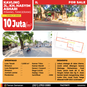 TSI/17677 For Sale Kavling Jl. KH. Hasyim Ashari, Tangerang, 3.600 m², SHM Harga Rp 10 Juta /m² Alamat Pinang, Tangerang Deskripsi Properti Lokasi strategis di Jalan Utama, cocok untuk dibangun Sarana Olahraga, Perkantoran, Food Court, posisi hook (di Jl. KH. Hasyim Ashari dan Gg H. Jiran) bentuk tanah mengantong, lebar muka 15m, muat Truck, harga dibawah NJOP 2023 12Jt/meter Luas Tanah 3,600 m² Dimensi - Luas Bangunan - Dimensi - Jumlah Lantai - Perabotan - Kamar Tidur - Kamar Mandi - Garasi / Carport - Jalur Telepon - Daya Listrik - Hadap / View - Sertifikat SHM LJH Realty Taman Semanan Property Help ✆ 0212903xxxx