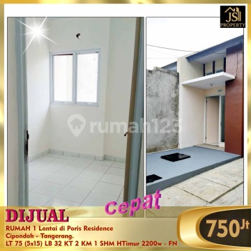 DIJUAL RUMAH 1 Lantai di Poris Residence Cipondoh - Tangerang. Keamanan Cluster 24 jam, Dekat Stasiun Batu Ceper, Stasiun Poris , RS Cipondoh, Sekolahan, Supermarket , Pasar,dll. Luas Tanah 75 m² Ukuran Dimensi 5 x 15 m² Luas Bangunan 32 m² 1 Lantai Kamar Tidur 2 Kamar Mandi 1 Listrik 2200 Watt Air PAM Hadap Timur SHM Carport 1 Mobil Row Jalan 2 Mobil Siap Huni Harga 750Jt Nego - FN