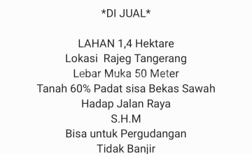 Dijual Tanah 1,4 Ha di Zona Industri Rajeg,Tangerang Lebar muka 50 meter Tanah 60% padat, sisa 40% bekas sawah Hadap jalan raya Lokasi tidak banjir Bisa utk industri atau utk gudang Harga penawaran seb 11 M Utk info lebih lanjut,bpk/ibu harao hubungi Sandy hp no.0816169xxxx kode listing sandy-edhy2