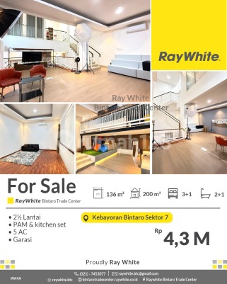 CLUSTER PREMIUM BINTARO! Rumah Cantik Siap Huni di Kebayoran Bintaro - Cluster One Gate! Spesifikasi Luas tanah 136 m2 Luas bangunan 200 m2 KT 3+1 KM 2+1 2 1/2 lantai kitchen set garasi Air PAM SHM Lokasi strategis dekat dengan : - Pasar Modern : Pasar Modern Bintaro, Fresh Market Emerald Bintaro,Pasar Segar Graha raya - Pusat Perbelanjaan : Lotte Mart Mall, BXC Mall 1&2, Hari hari Swalayan, Transpark Mall, Bintaro Plaza, Living Plaza Bintaro, Electronic City. - Rumah Sakit : RS Pondok Indah Bintaro (dalam Lingkup kawasan discovery), RS Premier Bintaro, RS Mitra Keluarga. - Mudah Sarana Transportasi : Feeder Busway Bintaro, Stasiun Jurangmangu, Stasiun Sudimara, Stasiun Pd Ranji. - Sekolah Baik Taraf Nasional / Internasional : British International School, Global Jaya School, Sekolah BPK Penabur, STAN, UPJ, Sekolah Islam Aulia, dll. - Akses Toll Pd Aren, Akses Toll Kunciran - Serpong. - Akses jalan menuju Jakarta - BSD-Serpong - Ciputat. Harga : Rp4.3 M (nego) *(ir)