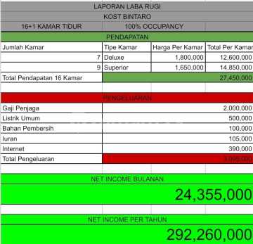 Dijual Cepat kost di Bintaro. ROI Tinggi 8-10%, Okupansi 100% LOKASI STRATEGIS, Dekat dengan: - KAMPUS (STAN) - PERKANTORAN - MALL (Bintaro Plaza, Bintaro Xchange) - RS (Mitra Keluarga, Premier Bintaro) - Stasiun (Pondok Ranji) - Tol (Bintaro Viaduct) SHM LT: 130 m2* ( 9x14 m) LB: 230 m2* (2.5 lantai) 16 + 1 Kmr Tidur 16 + 1 Kmr Mandi Jalan Akses Mobil 16 Token Listrik Kamar 1.300 Watt + 1 Token Utama 2.200 Watt Harga Sewa Kamar Superior 1.650.000 / bulan Deluxe 1.800.000 / bulan FASILITAS 1. Bangunan Kost Baru dan full Lantai Vinyl tiap kamar dan koridor 2. Elektronik tiap kamar: AC, Water Heater, GOOGLE TV 32 Inch, bisa NetFlix dan Youtube. 3. Furniture tiap kamar: Dipan, Ranjang, Gorden, Lemari PVC, Meja dan Kursi Kerja, Cermin besar, Nakas (deluxe) 4. Token Listrik tiap Kamar 5. Dispenser Air RO 6. Dapur Bersama dilengkapi Kabinet, Kulkas, Microwave, Rice Cooker dan Peralatan Masak lainnya 7. Ruang Makan Bersama 8. Ruang Cuci & Jemur: dilengkapi mesin cuci dan jemuran 8. CCTV 24 Jam* KOS Baru + Furniture Baru + Elektronik Baru, Occupancy FULL 100% Tinggal diLanjutkan NET INCOME Rp 24,3 Juta/ bln atau Rp 292,2 Juta bersih/ tahun DIJUAL CEPAT 3,65 M nego aby