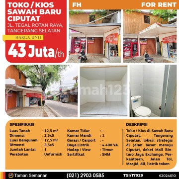 TSI/17929 For Rent Toko / Kios di Bintaro, Jl. Tegal Rotan Raya, Sawah Baru Ciputat, Tangerang Selatan, 12.5 m², 1 Lt, SHM Harga Rp 43.000.000 /th Alamat Jl. Tegal Rotan Raya, Tangerang Selatan Deskripsi Properti Lokasi strategis di jalan besar menuju Ciputat, deket Mall Bintaro Jaya Exchange, Stasiun Jurang Mangu, Pasar Modern Bintaro, Perkantoran, Jalan Tol, Masjid, dll. Cocok untuk gerai makanan, alat tulis, florist, counter hp, dropoff point ekspedisi (JNE, J&T, dlsb), dll. Luas Tanah 12,5 m² Dimensi 2,5×5 Luas Bangunan 12,5 m² Dimensi 2,5×5 Jumlah Lantai 1 Perabotan Unfurnish Kamar Tidur - Kamar Mandi 1 Garasi / Carport - Jalur Telepon - Daya Listrik 4.400 VA Hadap / View Timur Sertifikat SHM LJH Realty Taman Semanan