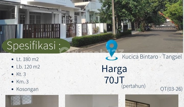 Disewakan Rumah luas 180 m Bintaro Jaya Sektor 9 akses tol : Parigi dan Pondok Aren KRL Station: Sudimara dan Jurang Mangu Bedrooms: 3 bathrooms: 3 carport 2 kondisi rumah bersih terawat dan nyaman untuk dihuni. Unfurnished IDR 70 juta