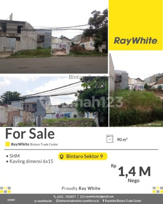 For Sale! Kavling Murah Siap Bangun di Perumahan Nyaman Bintaro Sektor 9 Spesifikasi Luas tanah 90 m2 Dimensi 6x15 SHM Lokasi strategis dekat dengan : * Pasar Modern : Pasar Modern Bintaro, Fresh Market Emerald Bintaro,Pasar Segar Graha raya * Pusat Perbelanjaan : BXC Mall 1&2, Lotte Mart Mall, Hari hari Swalayan, Transpark Mall, Bintaro Plaza, Living Plaza Bintaro, Electronic City. * Rumah Sakit : RS Pondok Indah Bintaro (dalam Lingkup kawasan discovery), RS Premier Bintaro, RS Mitra Keluarga. * Mudah Sarana Transportasi : Feeder Busway Bintaro, Stasiun Jurangmangu, Stasiun Sudimara, Stasiun Pd Ranji. * Sekolah Baik Taraf Nasional / Internasional : British International School, Global Jaya School, Sekolah BPK Penabur, STAN, UPJ, Sekolah Islam Aulia, dll. * Akses Toll Pd Aren, Akses Toll Kunciran - Serpong. * Akses jalan menuju Jakarta - BSD-Serpong - Ciputat. harga Rp1.4 M nego *(hny)