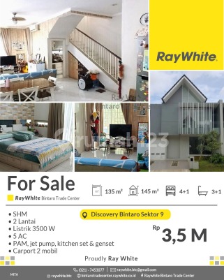For Sale! Rumah Bagus Bangunan Kokoh di Discovery Bintaro Spesifikasi rumah Luas tanah 135 m2 Luas bangunan 145 m2 4+1 kamar tidur 3+1 kamar mandi 2 lantai AC 5 unit Listrik 3500 Va PAM, jet pump, carport 2 mobil, kitchen set, genset SHM Lokasi strategis dekat dengan : * Pasar Modern : Pasar Modern Bintaro, Fresh Market Emerald Bintaro,Pasar Segar Graha raya * Pusat Perbelanjaan : BXC Mall 1&2, Lotte Mart Mall, Hari hari Swalayan, Transpark Mall, Bintaro Plaza, Living Plaza Bintaro, Electronic City. * Rumah Sakit : RS Pondok Indah Bintaro (dalam Lingkup kawasan discovery), RS Premier Bintaro, RS Mitra Keluarga. * Mudah Sarana Transportasi : Feeder Busway Bintaro, Stasiun Jurangmangu, Stasiun Sudimara, Stasiun Pd Ranji. * Sekolah Baik Taraf Nasional / Internasional : British International School, Global Jaya School, Sekolah BPK Penabur, STAN, UPJ, Sekolah Islam Aulia, dll. * Akses Toll Pd Aren, Akses Toll Kunciran - Serpong. * Akses jalan menuju Jakarta - BSD-Serpong - Ciputat. Harga Rp3,5 M nego *(mta)