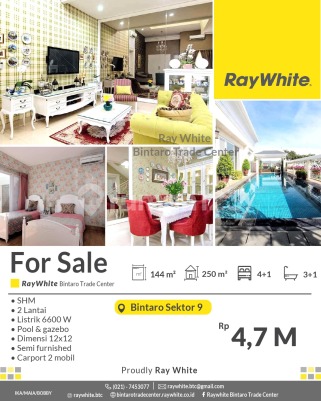 For Sale! Rumah Mewah dengan Private Pool di Discovery Bintaro Sektor 9 Spesifikasi Luas tanah 144 m2 Luas bangunan 250 m2 KT 4+1 KM 3+1 2 lantai Listrik 6000 Va dimensi 12x12 semi furnished carport 2 mobil pool, gazebo SHM Lokasi strategis dekat dengan : - Pasar Modern : Pasar Modern Bintaro, Fresh Market Emerald Bintaro,Pasar Segar Graha raya - Pusat Perbelanjaan : Lotte Mart Mall, BXC Mall 1&2, Hari hari Swalayan, Transpark Mall, Bintaro Plaza, Living Plaza Bintaro, Electronic City. - Rumah Sakit : RS Pondok Indah Bintaro (dalam Lingkup kawasan discovery), RS Premier Bintaro, RS Mitra Keluarga. - Mudah Sarana Transportasi : Feeder Busway Bintaro, Stasiun Jurangmangu, Stasiun Sudimara, Stasiun Pd Ranji. - Sekolah Baik Taraf Nasional / Internasional : British International School, Global Jaya School, Sekolah BPK Penabur, STAN, UPJ, Sekolah Islam Aulia, dll. - Akses Toll Pd Aren, Akses Toll Kunciran - Serpong. - Akses jalan menuju Jakarta - BSD-Serpong - Ciputat. Harga : Rp4,7 M (nego) *(ik/mya/bby)