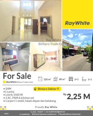 HARGA TERMURAH! Rumah Siap Huni di Area Premium Bintaro Sektor 9 Spesifikasi Luas tanah 120 m2 Luas bangunan 80 m2 KT 2+1 KM 1+1 1 lantai Listrik 3500 Va AC 3 unit PAM, kitchen set, carport 1 mobil halaman depan dan belakang SHM Lokasi strategis dekat dengan : - Pasar Modern : Pasar Modern Bintaro, Fresh Market Emerald Bintaro,Pasar Segar Graha raya - Pusat Perbelanjaan : Lotte Mart Mall, BXC Mall 1&2, Hari hari Swalayan, Transpark Mall, Bintaro Plaza, Living Plaza Bintaro, Electronic City. - Rumah Sakit : RS Pondok Indah Bintaro (dalam Lingkup kawasan discovery), RS Premier Bintaro, RS Mitra Keluarga. - Mudah Sarana Transportasi : Feeder Busway Bintaro, Stasiun Jurangmangu, Stasiun Sudimara, Stasiun Pd Ranji. - Sekolah Baik Taraf Nasional / Internasional : British International School, Global Jaya School, Sekolah BPK Penabur, STAN, UPJ, Sekolah Islam Aulia, dll. - Akses Toll Pd Aren, Akses Toll Kunciran - Serpong. - Akses jalan menuju Jakarta - BSD-Serpong - Ciputat. Harga : Rp2.25 M (nego) *(hnny)