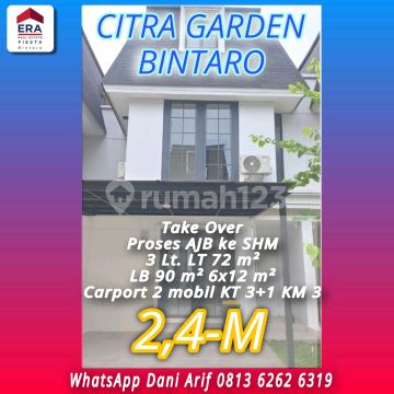 Bismillahirrahmanirrahim Jual /take over Citragarden Bintaro Luas bangunan : 90m Luas tanah : 72m Lebar x panjang : 6x12m Hadap : Jumlah kamar tidur : 3KT+1 ruang Etnik kamar mandi : 3KM Jumlah lantai: 3 lantai Garasi : Carport: 2 mobil Air : PDAM Daya Listrik : 2200 Watt Sertifikat : AJB Proses SHM unfurnish Harga: 2.4M WhatsApp Dani Arif 0813xxxxxxxx Terimakasih Salam Properti IG : @arif.konsultan.properti.era