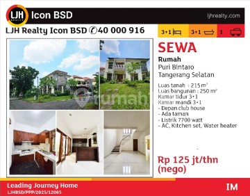 SEWA Rumah Puri Bintaro Tangerang Selatan Luas tanah : 215 m' Luas bangunan : 250 m* Kamar tidur 3+1 Kamar mandi 3+1 - Depan club house - Ada taman - Listrik 7700 watt - AC, Kitchen set, Water heater KALAU MAU FULL FURNISHED 150jt/nego (tinggal bawa koper)