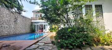 Rumah mewah di lengkapi dengan Kolam renang Terletak di lingkungan yang tenang Dalam perumahan dengan keamanan yang terjamin Kolam renang pribadi untuk bersantai dan menikmati waktu bersama keluarga Taman yang hijau dan indah untuk menambah kesegaran udara di sekitar rumah spesifikasi : luas tanah 706, luas bangunan 580, hadap barat, 1 lantai, 4+2kt, 5+1km, 4400 watt 7 AC, air jetpump artesis fasilitas lain : kolam renang, solar hard, water heater, torn, garasi 2 mobil, carport 3 mobil, dak jemur, halaman samping, halaman depan, halaman belakang, shm