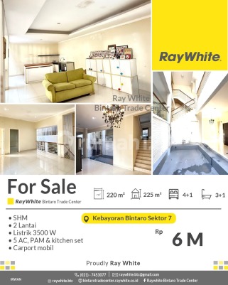 RUMAH MEWAH BINTARO - SIAP HUNI di Lingkungan Asri Kebayoran Bintaro Sektor 7 Spesifikasi Luas tanah 220 m2 Luas bangunan 225 m2 Kamar tidur 4+1 Kamar mandi 3+1 2 lantai Listrik 5500 Va PAM, kitchen set AC 5 Unit SHM Lokasi strategis dekat dengan : - Pasar Modern : Pasar Modern Bintaro, Fresh Market Emerald Bintaro,Pasar Segar Graha raya - Pusat Perbelanjaan : Lotte Mart Mall, BXC Mall 1&2, Hari hari Swalayan, Transpark Mall, Bintaro Plaza, Living Plaza Bintaro, Electronic City. - Rumah Sakit : RS Pondok Indah Bintaro (dalam Lingkup kawasan discovery), RS Premier Bintaro, RS Mitra Keluarga. - Mudah Sarana Transportasi : Feeder Busway Bintaro, Stasiun Jurangmangu, Stasiun Sudimara, Stasiun Pd Ranji. - Sekolah Baik Taraf Nasional / Internasional : British International School, Global Jaya School, Sekolah BPK Penabur, STAN, UPJ, Sekolah Islam Aulia, dll. - Akses Toll Pd Aren, Akses Toll Kunciran - Serpong. - Akses jalan menuju Jakarta - BSD-Serpong - Ciputat. Harga Rp6 M nego *(ir)