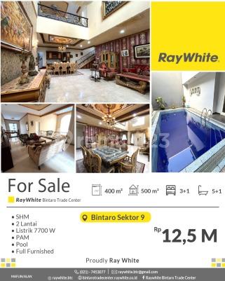 Rumah Mewah Fully Furnish dengan Kolam Renang di Bintaro Sektor 9 - Harga Nego! Spesifikasi Luas tanah 400 m2 Luas bangunan 500 m2 Kamar tidur 3+1 Kamar mandi 5+1 2 lantai Listrik 7700 Va PAM Pool Full Furnished Hook SHM Lokasi strategis dekat dengan : * Pasar Modern : Pasar Modern Bintaro, Fresh Market Emerald Bintaro,Pasar Segar Graha raya * Pusat Perbelanjaan : Lotte Mart Mall, BXC Mall 1&2, Hari hari Swalayan, Transpark Mall, Bintaro Plaza, Living Plaza Bintaro, Electronic City. * Rumah Sakit : RS Pondok Indah Bintaro (dalam Lingkup kawasan discovery), RS Premier Bintaro, RS Mitra Keluarga. * Mudah Sarana Transportasi : Feeder Busway Bintaro, Stasiun Jurangmangu, Stasiun Sudimara, Stasiun Pd Ranji. * Sekolah Baik Taraf Nasional / Internasional : British International School, Global Jaya School, Sekolah BPK Penabur, STAN, UPJ, Sekolah Islam Aulia, dll. * Akses Toll Pd Aren, Akses Toll Kunciran - Serpong. * Akses jalan menuju Jakarta - BSD-Serpong - Ciputat. Harga Rp12,5 M nego *(mfln)