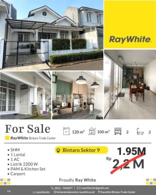 info detail hub Icha Spesifikasi: *Luas tanah 120 m2 *Luas bangunan 100 m2 *Kamar tidur 2 *Kamar mandi 2 *1 Lantai *1 AC *PAM *Kitchen Set *Carport *Listrik 2200 Watt *Sertifikat : SHM Akses strategis mudah kemana saja, keamanan 24 jam: +Dekat pintu toll Jkt-Serpong +Dekat stasiun Sudimara, Jurang Mangu, Pondok Ranji +Dekat pusat perbelanjaan Pasar Modern Bintaro +Dekat Mall Bintaro X change, Bintaro Plaza, Lotte Mall +Dekat Rumah Sakit Pondok Indah Bintaro, Premier Bintaro Mitra Keluarga +Dijamin Bebas Banjir +Keamanan 24 jam Harga 1,95 M (nego) *Fi