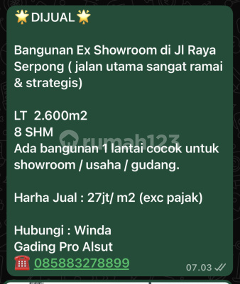 DIJUAL Bangunan Ex Showroom di Jl Raya Serpong ( jalan utama sangat ramai & strategis) LT 2.600m2 8 SHM Ada bangunan 1 lantai cocok untuk showroom / usaha / gudang. Harga Jual : 27jt/ m2 (exc pajak) Hubungi : Jennifer Aiko- GadingPro 08770022xxxx //winda