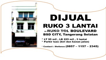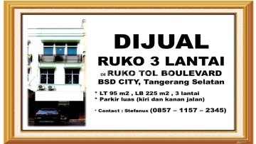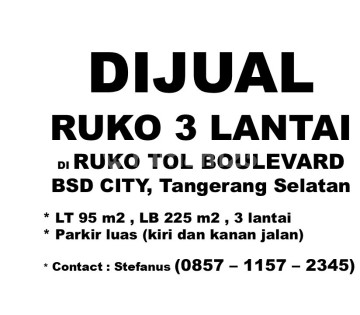 Dijual Ruko di Area Ruko Tol Boulevard BSD City yang merupakan pertokoan yang disediakan Sinarmas Group sebagai pengembang BSD City. Alamat : Jl. Pahlawan Seribu, Serpong, Tangerang 15322 LT 95 m², LB 225 m², 3 lantai Parkir luas (kiri dan kanan jalan) Harga Jual sebesar Rp.3.000.000.xxx,- Anda berminat ? Informasi lebih lanjut, silahkan hubungi Stefanus 08571157xxxx