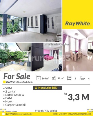 For Sale! Rumah Modern Siap Huni di BSD City - Posisi Hook, Lingkungan Nyaman Spesifikasi Luas tanah 166 m2 Luas bangunan 99 m2 Kamar tidur 3 Kamar mandi 4 2 lantai Listrik 6600 VA PAM, Hook, carport 3 mobil SHM Lokasi Strategis dekat dengan Stasiun Commuter Line dan Akses Pintu Tol Jkt-Serpong Dekat dengan Pusat perbelanjaan Pasar Modern BSD Dekat dengan Sekolah dan Universitas Dekat Sekolah, PS. Modern AEON, ITC BSD RS Medika, RS Eka Hospital Bebas Banjir dan Aman Harga Rp3,3 M nego *(nyo/vna)
