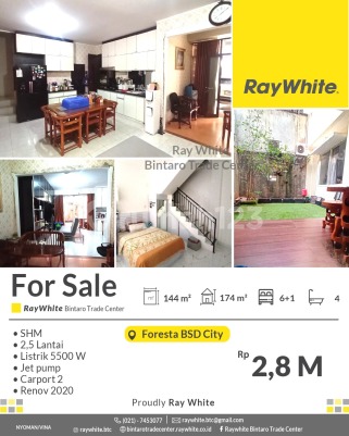 Harga Terjangkau! Rumah di Lingkungan Asri Foresta BSD City - Cluster NYAMAN BSD Spesifikasi Luas tanah 144 m2 Luas bangunan 174 m2 Kamar tidur 6+1 Kamar mandi 4 2,5 lantai Listrik 5500 VA jet pump carport 2 Renov 2020 SHM Lokasi Strategis dekat dengan Stasiun Commuter Line dan Akses Pintu Tol Jkt-Serpong Dekat dengan Pusat perbelanjaan Pasar Modern BSD Dekat dengan Sekolah dan Universitas Dekat Sekolah, PS. Modern AEON, ITC BSD RS Medika, RS Eka Hospital Bebas Banjir dan Aman Harga Rp2,8 M nego *(nyo/vna)