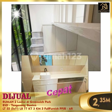 DIJUAL RUMAH 2 Lantai di Greenwich Park BSD - Tangerang, Banten Luas Tanah 55 m² Dimensi 5 x 11 m² Luas Bangunan 77 m² 2 Lantai Kamar Tidur 3 Kamar Mandi 3 Full Furnish Listrik 2200 Watt Air PAM Sertifikat PPJB Spacious Balcon Harga 2,350 M Nego Info & Survey , hub : Fenny 08212553xxxx