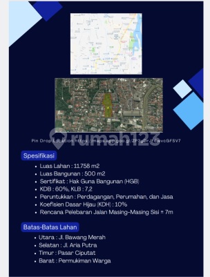 Dijual Tanah bonus rumah 500m2 Strategis Akses mobil besar pinggir jalan Raya Aria Putra lokasi kawasan komersial di Ciputat Tangerang Selatan Harga : 8 jt/meter (nego) Spesifikasi: - Luas Lahan : 11.758 m2 - Luas bangunan : 500 m2 - Sertifikat : SHGB - Legalitas Clean and Clear dijamin 100% Aman - KDB : 60%, KLB: 7,2 - Peruntukan : Perdagangan, Perumahan dan Jasa - Koefisien Dasar Hijau (KDH) : 10% - Rencana pelebaran masing2 sisi 7 meter Batas - batas Lahan: - Utara : Jl Bawang merah. - Selatan : Jl Aria Putra - Timur : Pasar Ciputat - Barat : Permukiman warga Selling point: - Bisa dilewati mobil besar 40 feed - Dekat perbelanjaan - Dekat pasar - Dekat Rumah sakit - Dekat Perkantoran - Dekat Sekolahan - Dekat Transportasi umum - Dekat Pintu tol Cocok buat Perkantoran, Rumah Sakit, Pergudangan, Town house, Restoran, Hotel, Pertokoan dll Hanya untuk langsung pembeli/investor serius (tanpa perantara lain) Minat serius hubungi: P Djaya 0821xxxxxxxx