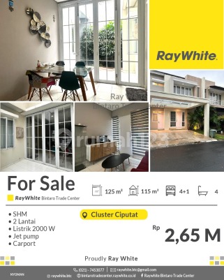 For Sale! Rumah Cantik MODERN dan SIAP HUNi di Cluster Ciputat - Harga Nego Spesifikasi Luas tanah : 125 m² Luas bangunan : 115 m2 Kamar tidur 4+1 Kamar mandi 4 2 lantai Listrik 2200 Va Air Jetpump SHM Dekat ke : - RS Buah Hati Ciputat - Pasar Jombang - Stasiun Sudimara dan Jurangmangu - Pompa bensin Shell - Universitas pembangunan jaya - Pasar Ciputat - Bintaro Xchange - Sekolah SMP dan SMA Harga Rp2,65 M nego *(nyo/vna)