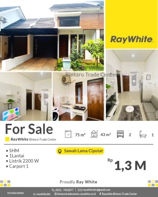 For Sale! Rumah Murah Siap Huni di Cluster Sawah Lama Ciputat - dekat Bintaro Spesifikasi Luas tanah : 75 m2 Luas bangunan : 43 m2 Kamar tidur 2 Kamar mandi 1 1 lantai jet pump, carport, semi furnished Listrik 2200 Va SHM Lokasi strategis dekat Bintaro Jaya, Ciputat. Dekat fasilitas umum seperti : * Gerbang Tol Pondok Aren 1 dan 2 * Stasiun Jurang Mangu * Mall Bintaro Xchange * Universitas Pembangunan Jaya * Kantor Kecamatan Ciputat Harga Rp1,3 M nego *(ist/nrrmn)