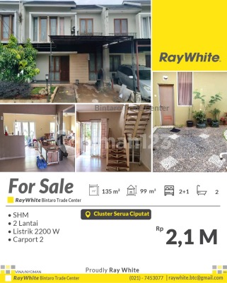 For Sale! Rumah Siap Huni 2 Lantai di Cluster Ciputat - Harga Nego! Spesifikasi Luas tanah : 135 m² Luas bangunan : 99 m2 Kamar tidur 2+1 Kamar mandi 2 2 lantai Listrik 2200 Va carport 2 mobil SHM Lokasi strategis : - RS Buah Hati Ciputat - Pompa bensin Shell - Universitas pembangunan jaya - Stasiun Sudimara dan Jurangmangu - Pasar Ciputat - Bintaro Xchange - Sekolah SMP dan SMA Harga Rp2,1 M nego *(nyo/vna)